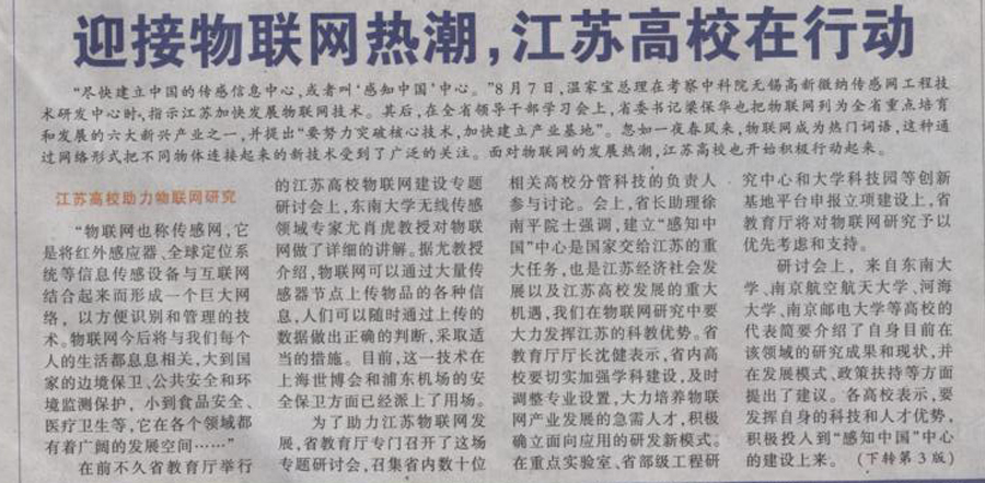 【江蘇教育報】迎接物聯網熱潮 江蘇高校在行動