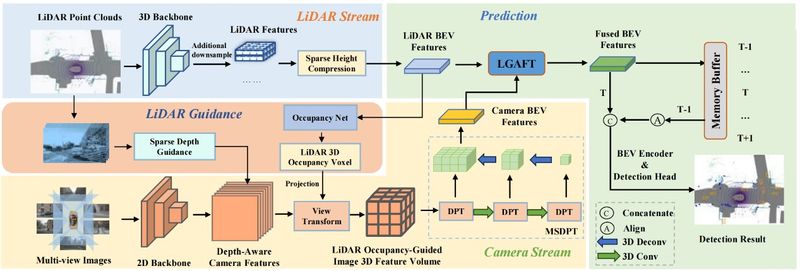 該論文聚焦于多模態3D目標檢測,特別是在鳥瞰圖(BEV)視角下的應用。研究團隊提出了一種名為GAFusion創新方法,通過稀疏深度引導(SDG)和激光雷達占據引導(LOG)生成具有豐富深度信息的3D特征,利用激光雷達引導的自適應融合transformer(LGAFT)從全局角度增強不同模態BEV特征之間的交互。此外,他們還設計了一個BEV網格來存放多尺度下采樣特征,并開發了多尺度雙路徑transformer(MSDPT),以擴大不同模態特征的接受域,顯著提高了檢測性能。GAFusion有助于自動駕駛領域安全性的重大提升,也為多模態3D目標檢測領域后續的研究提供更多的見解。該研究成果同時得到了國家自然基金重點項目課題、國家自然基金面上項目等的支持。