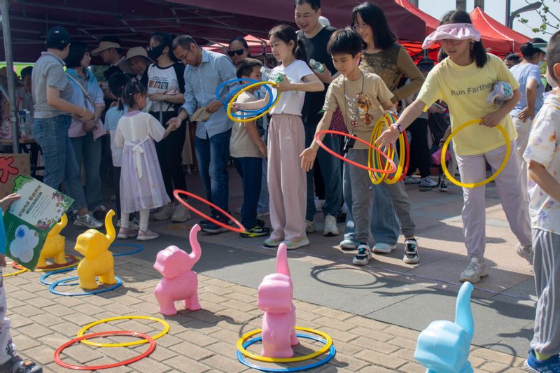 幼兒園老師準備了豐富的親子活動,父子齊上陣、母女同心圓,一起玩彩虹傘、做益智題,加強了親子溝通,拉近了家校之間的距離。全場播放著歡快的音樂,學生志愿者們吹起氣球,捏成不同的造型,吸引了小朋友的圍觀和排隊。親子后備箱集市上打開一個個小商鋪,圖書、玩具種類繁多,小朋友們在攤位上介紹玩具、互換商品,倡導綠色低碳生活,收獲了快樂和友誼。
