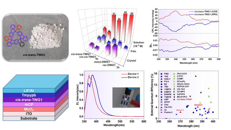 三角風車格類有機納米烴的物質形態、圓偏振發光行為以及UV OLED