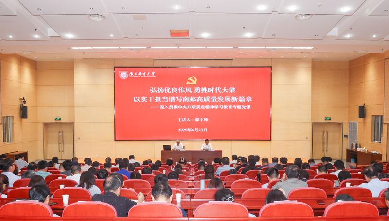 郭宇鋒以《弘揚優良作風 勇挑時代大梁 以實干擔當譜寫南郵高質量發展新篇章》為題,從“全面認識黨的作風建設的重要時代意義、深刻感悟貫徹中央八項規定精神的經驗啟示、持之以恒以作風建設新成效推動學校高質量發展”等三個方面,詳盡講述了中國共產黨作風建設的歷史進程與經驗啟示,回顧了當前學校開展深入貫徹中央八項規定精神學習教育的實踐做法,深入剖析了學校內涵建設方面存在的短板不足,并結合“十五五”規劃制定,系統謀劃了今后學校事業發展的方向和思路。