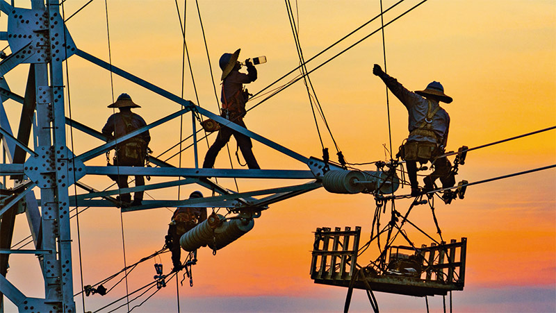 提高人民生活品質是暢通國內大循環的出發點和落腳點,也是國內國際雙循環相互促進的重要聯結點。圖為2022年8月18日,在江蘇省鎮江市220千伏天王至江寧牽引站線路工程現場,江蘇省送變電有限公司施工人員在高溫酷暑下加緊建設,全力保障企業生產、居民生活用電需求。