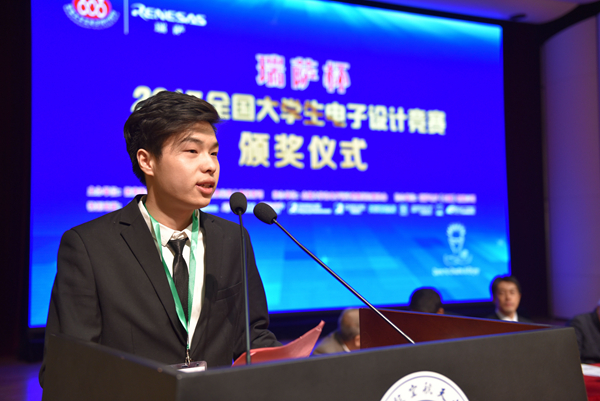 南京郵電大學(xué)學(xué)生王博作為唯一的獲獎學(xué)生代表發(fā)言 日前,由教育部和工信部聯(lián)合主辦的2017全國大學(xué)生電子設(shè)計競賽頒獎儀式在北京航空航天大學(xué)舉行。大賽組委會主任、兩院院士王越為獲得本次競賽本科組最高獎的南京郵電大學(xué)代表隊頒獎。 據(jù)悉,獲獎團隊主要成員、南京郵電大學(xué)電子與光學(xué)工程學(xué)院大四學(xué)生王博作為唯一的獲獎學(xué)生代表在頒獎儀式上發(fā)言。“我大一上學(xué)期加入校科協(xié)和創(chuàng)新實踐基地,成為了一名電子DIY愛好者。大二時,我結(jié)識了兩位給力的隊友,一同加入老師的自動控制科研小組,參與了有關(guān)飛行器、智能車、機器人等相關(guān)的科研項目。大三上學(xué)期,我們參與了多個科研項目,獲得2017年全國大學(xué)生智能互聯(lián)創(chuàng)新應(yīng)用大賽國家一等獎及ARM創(chuàng)新大獎。”據(jù)介紹,南郵組建了三十余老師的電子設(shè)計與創(chuàng)新訓(xùn)練指導(dǎo)團隊,緊跟信息技術(shù)最新發(fā)展,關(guān)注電子設(shè)計競賽領(lǐng)域的最新發(fā)展動態(tài)。“當(dāng)我們看到了今年的賽題時,心中萬分高興,對于四軸飛行器,我們有準(zhǔn)備,有項目經(jīng)歷。”王博說,此次在肖建、蔡志匡老師指導(dǎo)下獲得最高獎,得益于學(xué)校較為成熟的培訓(xùn)體系和選拔機制。