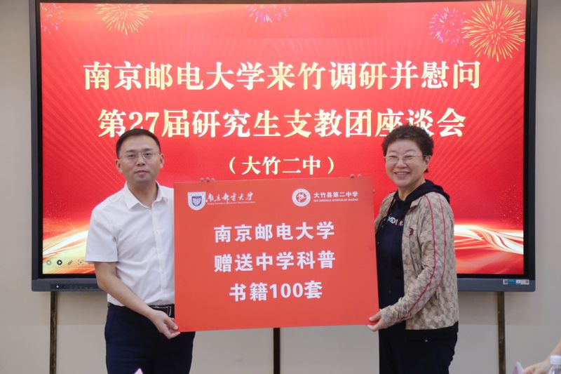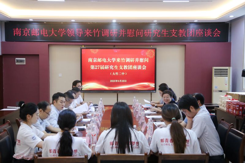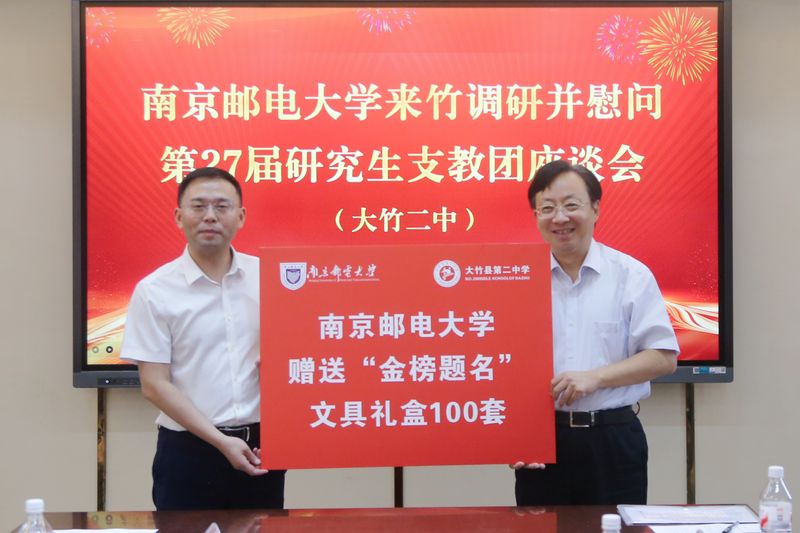 座談會現場 葉美蘭向大竹縣各級領導及大竹縣第二中學對研支團成員的悉心指導和周到保障表示感謝。她說,南京郵電大學是一所紅色基因厚重、信息特色鮮明的國家“雙一流”建設高校,是新中國第一所郵電學校,而研究生支教團項目正是南郵聚焦人才培養,落實立德樹人根本任務的重要舉措。她勉勵同學們要將個人理想與國家命運相融合,扎根大竹基層沃土,把教書育人的使命任務踐行在實際的行動中,展現南郵學子的責任與擔當。 劉陳回顧了南郵與四川大竹多年來的深厚友誼,對大竹縣及大竹二中近些年取得的輝煌發展成就表示肯定。他說,大竹縣第二中學是南郵實施研究生支教團項目以來的首個支教地,十一年來大竹縣委、縣政府、團縣委、二中為支教團成員提供了堅實的工作和生活保障,期望全體研支團成員珍惜把握好社會各界提供的寶貴資源,把一年的支教歷程作為鍛煉和磨礪自身的寶貴財富。 陸世斌代表縣委、縣政府對南郵十一年來持續選派研究生支教團支持竹鄉教育表示感謝。他說,支教團成員將先進教育理念和深厚關愛帶入課堂與校園,顯著促進了大竹縣教育質量的提升。縣委、縣政府將全力做好服務保障,確保支教團成員安心從教、舒心生活,希望進一步深化與南郵在師資培訓、課程共建、人才培養及產學研融合等多方面的合作,共同推動校地協同邁向更高水平。 大竹縣第二中學充分肯定了南郵選派優秀學生為大竹縣基礎教育所作的貢獻,由衷感謝南郵對大竹二中馳而不息的支持,雙方還就進一步推動大中小學思政一體化、青年人才培養和強化校地合作等工作進行了深入交流。 調研座談會上,南郵向大竹二中贈送中學科普讀物100套、“金榜題名”文具禮盒100套,用于支持學生學習成長,傳遞南郵師生對竹鄉教育事業的持續關懷。