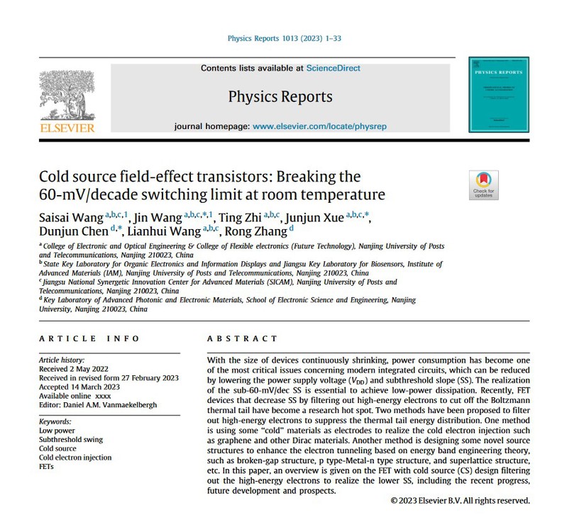 On March 21, Associate Professors Wang Jin, Zhi Ting, and Xue Junjun and their research group on low-dimensional compound semiconductor devices from the College of Electronic and Optical Engineering & College of Flexible electronics (Future Technology), along with Professor Chen Dunjun and Professor Zhang Rong from Nanjing University, jointly published a review article titled Cold source field-effect transistors: Breaking the 60-mV/decade switching limit at room temperature in Physics Reports (Physics Reports, 1013 (2023) 1-33). Associate Professors Wang Jin, Xue Junjun, and Professor Chen Dunjun are co-corresponding authors, and graduate student Wang Saisai and Associate Professor Wang Jin are the first authors of the paper. Nanjing University of Posts and Telecommunications as the first unit of the paper.