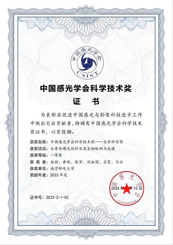 Recently, the CSIST announced the decision to award the 2023 CSIST Science and Technology Awards. After a rigorous evaluation process, including qualification review, expert evaluation by the award assessment group, deliberation by the award evaluation committee, voting, approval by the executive council, and website public notification, Professor Zhao Qiang’s team from our university has been honored with the First Prize in the Natural Science category for their project titled “Long-lifetime Phosphorescent Probes and Their Applications in Biological Sensing and Imaging.” This project, with a team comprising Zhao Qiang, Huang Wei, Zhang Yin, Liu Shujuan, Lv Wen, and Ma Yun, and Nanjing University of Posts and Telecommunications as the sole completing institution, stands as the only recipient of the First Prize in the natural science category for the 2023 CSIST Science and Technology Awards.
