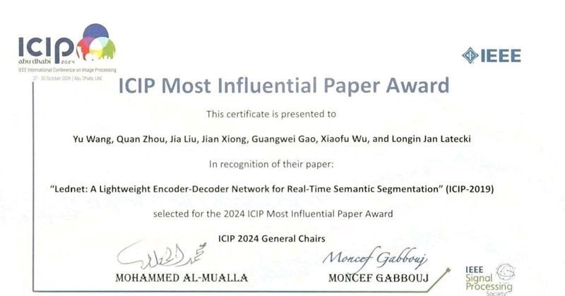 Recently, the paper “LEDNet: A Lightweight Encoder-Decoder Network for Real- Time Semantic Segmentation” won the 2024 IEEE International Conference on Image Processing Most Influential Paper Award, and was the only academic paper to win the award. Prof. Quan Zhou of College of Telecommunications & Information Engineering is the sole corresponding author of the paper, and the first author of the paper is Yu Wang, a 2020 master's degree graduate of our university.