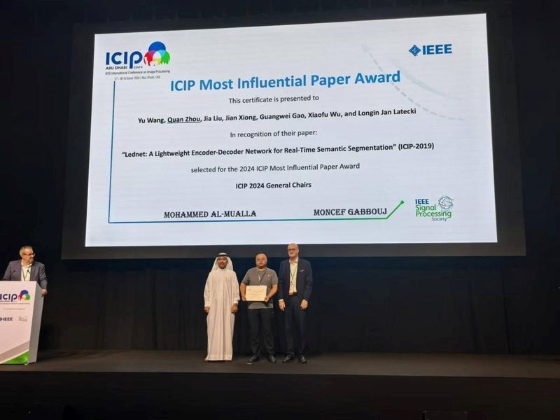 The IEEE ICIP Most Influential Paper Award is given to the paper with the highest number of citations out of all papers presented at the conference within the last five years. This is the first time this award will be given by IEEE ICIP in 2024, and only one paper has won the award. Prof. Quan Zhou's team paper proposes a lightweight asymmetric encoder-decoder network architecture for the first time to solve the difficulty of modeling semantic segmentation tasks using convolutional neural networks in mobile devices, which can be widely used in the fields of automated driving, remote sensing of drones and robot vision.